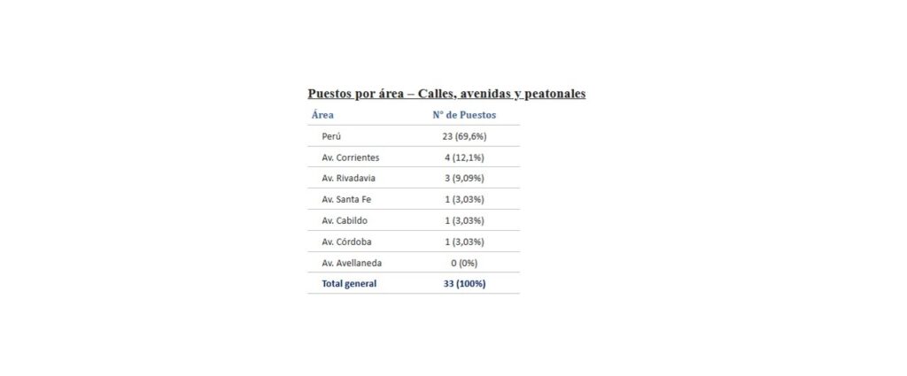 El relevamiento se llevó a cabo entre el 1° y el 27 de febrero de 2026 mediante un recorrido de observación de los puestos de comercio ilegal instalados en ambas aceras de las mencionadas avenidas, calles, estaciones, terminales y plazas.