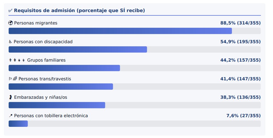 Finalmente, el mapeo realizado por MPD informa que, si bien la mayoría de los hoteles (88,5%) recibe personas extranjeras,más de la mitad no acepta grupos familiares (55,2%) ni embarazadas ni niños (60,8%). A su vez, sólo el 41,4% acepta trans/travestis y un 54,9%, personas con algún tipo de discapacidad. A esto se suma que la mayor parte de los hoteles presenta barreras arquitectónicas severas, además de diversos déficits estructurales en cuanto a las condiciones de habitabilidad (por ejemplo, solo 1 de cada 20 hoteles ofrece calefacción).