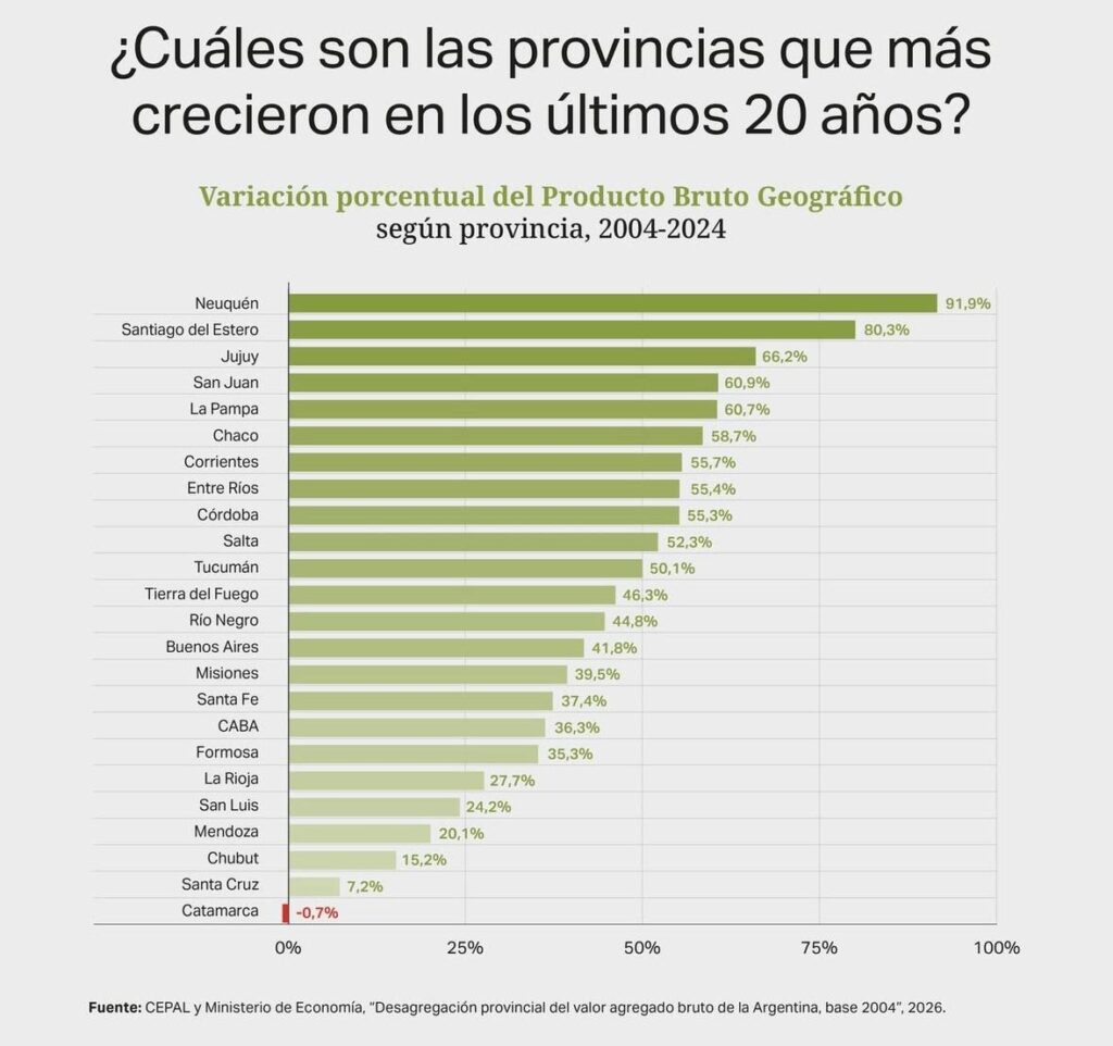 Por el contrario, provincias como Neuquén (91,9%), Santiago del Estero (80,3%), Jujuy (66,2%), San Juan (60,9%) y La Pampa (60,7%) mostraron una importante variación porcentual positiva del PBG durante estas dos décadas, según lo relevado mediante informes de la CEPAL y el Ministerio de Economía Nacional.